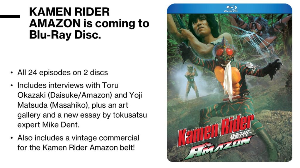 Durante seu painel na Otakon deste ano, a Discotek Media anunciou três importantes lançamentos em Blu-ray para o público norte-americano. As novidades incluem produções marcantes para os fãs de tokusatsu: Android Kikaider 01, Kamen Rider Amazon e Kamen Rider Stronger.