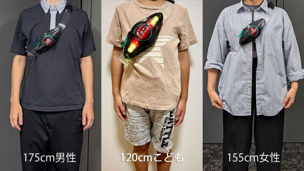 Outro ponto relevante é o material utilizado: a faixa frontal é feita de plástico transparente maleável, o que intensifica os efeitos de luz. Além disso, o cinturão é ajustável, com tamanho que vai de 55 cm a 105 cm, tornando possível que tanto crianças quanto adultos usem o item confortavelmente.