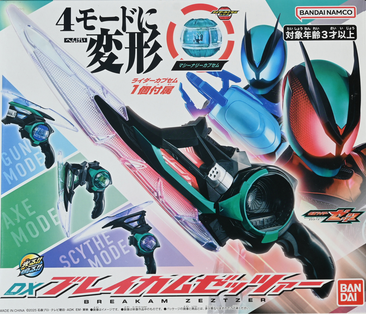 Se o cinturão impressiona pela inovação, a arma oficial do herói não fica para trás. O DX Breakam Zeztza (5.280 ienes), com lançamento previsto para 27 de setembro, é um equipamento versátil que assume quatro formas diferentes: espada, rifle, machado e foice.