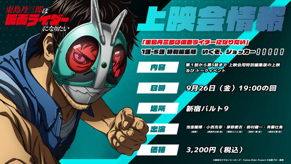 Antes da estreia oficial, o anime terá uma exibição especial no Shinjuku Wald 9, em Tóquio. No evento, será apresentada uma versão especialmente editada que reúne os cinco primeiros episódios sob o título “Tojima Tanzaburo quer ser Kamen Rider 1-5 Especial: Vamos lá, Shocker!!!!!”.